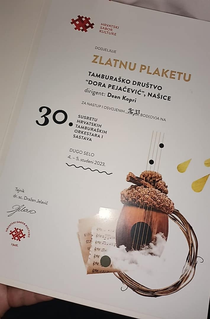 Na jubilarnom 30. Susretu hrvatskih tamburaških orkestara i sastava u Dugom Selu, orkestar Tamburaškog društva “Dora Pejačević” Našice osvojio je Zlatnu Plaketu. Orkestar se natjecao u kategoriji “koncertni orkestri” pod vodstvom dirigenta Deana Koprija. . Našički tamburaši otvorili su susret izvedbom hrvatske himne „Lijepa naša“, a natjecateljski program nastavili izvedbom kompozicija „Vrtuljak“ Siniše Leopolda, te „Ratnici svjetlosti“ našičkog skladatelja Daniela Koprija.